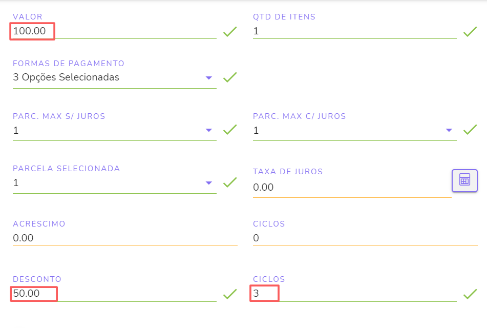 Desconto: corresponde ao valor fixo de desconto que será aplicado ao “x” primeiros ciclos de cobrança - você deve informar um valor maior que 0 no campo “Ciclos com desconto”.