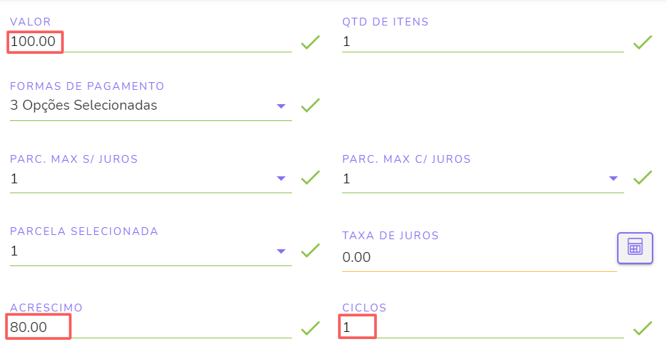 Acréscimo: corresponde ao valor fixo de acréscimo que será aplicado ao “x” primeiros ciclos de cobrança - você deve informar um valor maior que 0 no campo “Ciclos com acréscimo”.