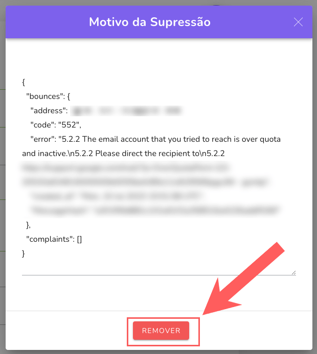 No Detalhe do Contato, é possível validar se o e-mail está na lista de bloqueio. Se este estiver bloqueado, é possível consultar o motivo do bloqueio e também remover da lista.