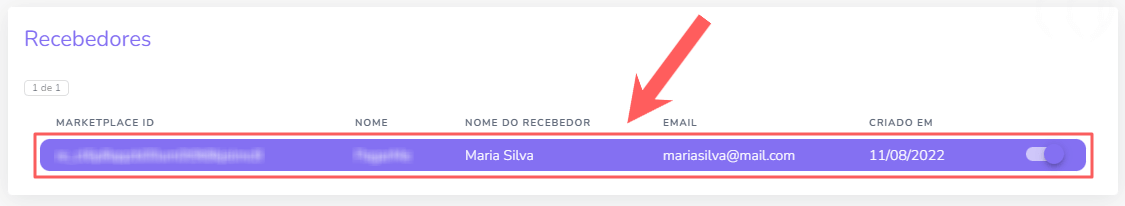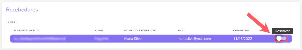 4 - Localize o cadastro de recebedor que deseja desativar e mude o botão Ativo para a posição Desligado.