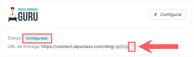6 - O status da integração aparecerá como Configurada; em seguida, copie e armazene a URL de Entrega.