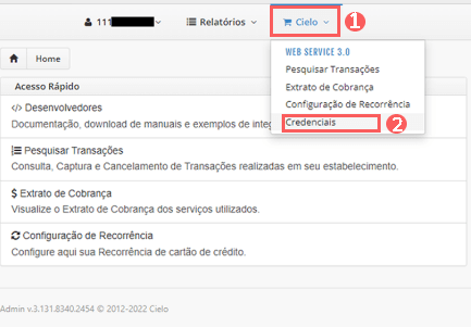 2 - Na menu superior, clique na opção Cielo e depois em Credenciais.