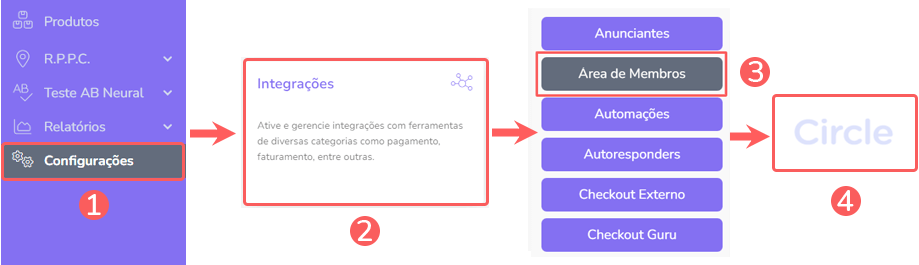 2 - No menu lateral, acesse Configurações > Integrações > Área de Membros > Circle