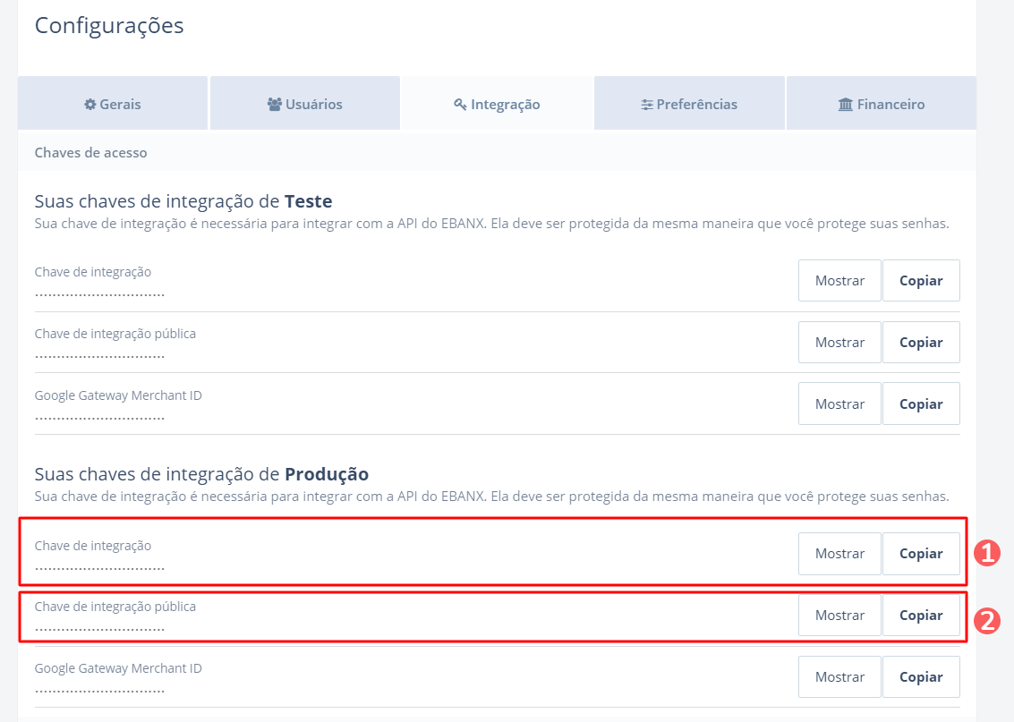 Chave de integração: clique em Copiar e armazene o valor copiado;