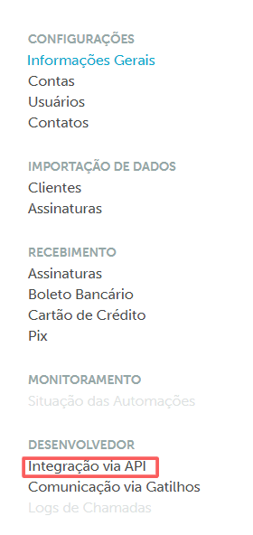 4 - No menu lateral esquerdo, nas opções de Desenvolvedor, clique em Integração via API .