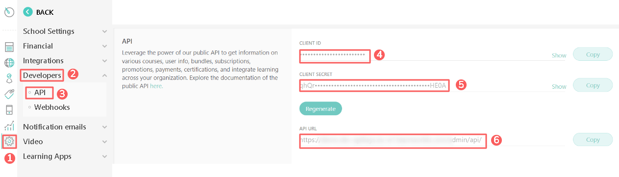 2 - No menu lateral, clique em Settings; em seguida, em Developers > API, e copie as credenciais de CLIENT ID; CLIENT SECRET e API URL.