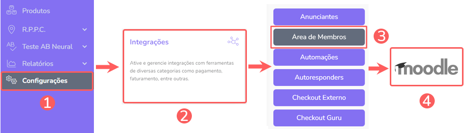 2 - No menu lateral, acesse Configurações > Integrações > Área de Membros > Moodle