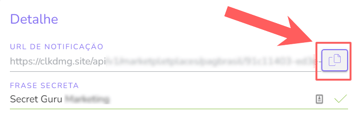 3 - Na aba Detalhe, copie e armazene a URL de Notificação criada após a ativação da integração.