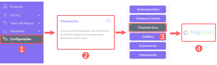 2 - Acesse Configurações > Integrações > Checkout Guru > PagBrasil