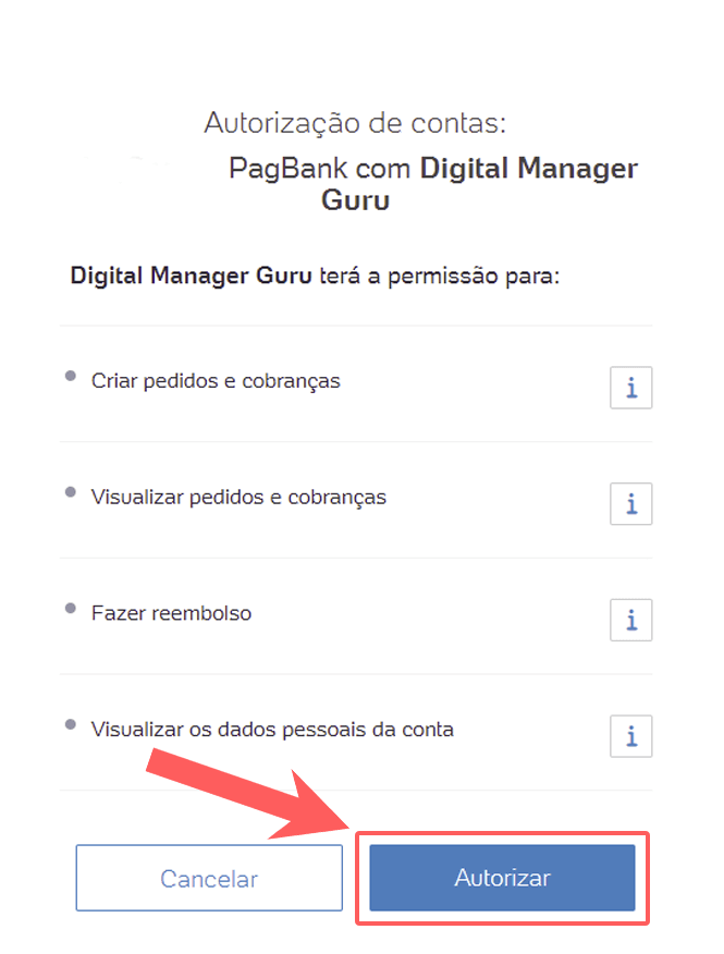 5 - Clique em Autorizar para permitir o acesso da sua conta Guru ao PagBank.