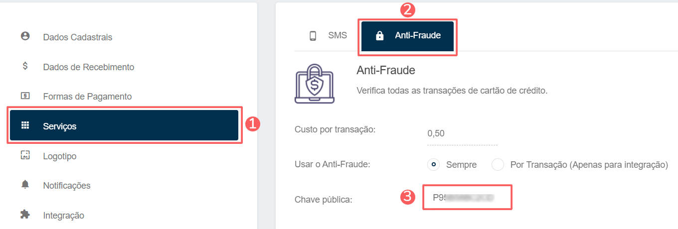 3 - Clique em Serviços > Anti-Fraude e copie e armazene a Chave Pública.