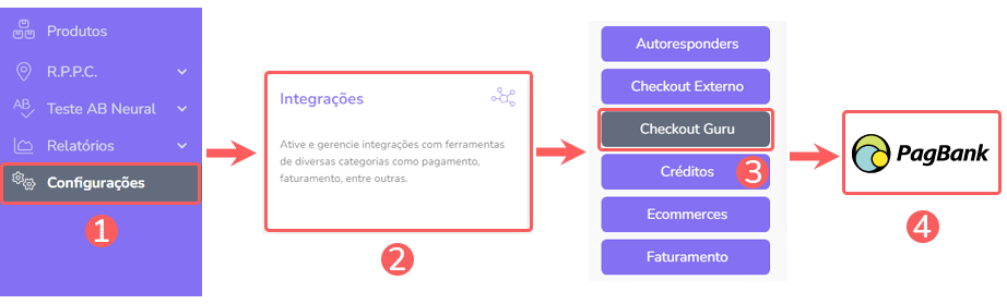 2 - Clique em Configurações > Integrações > Checkout Guru > PagBank