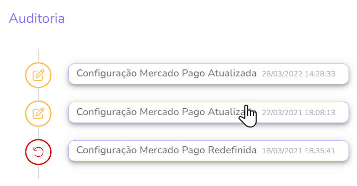 Você pode desativar, reativar sua integração com Mercado Pago e também consultar o histórico de alterações realizadas (auditoria).