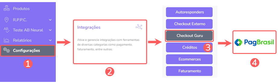 1 - Acesse Configurações > Integrações > Checkout Guru > PagBrasil