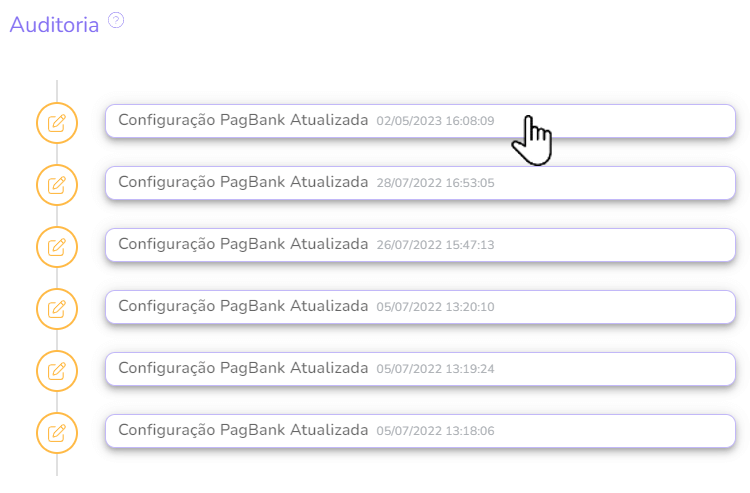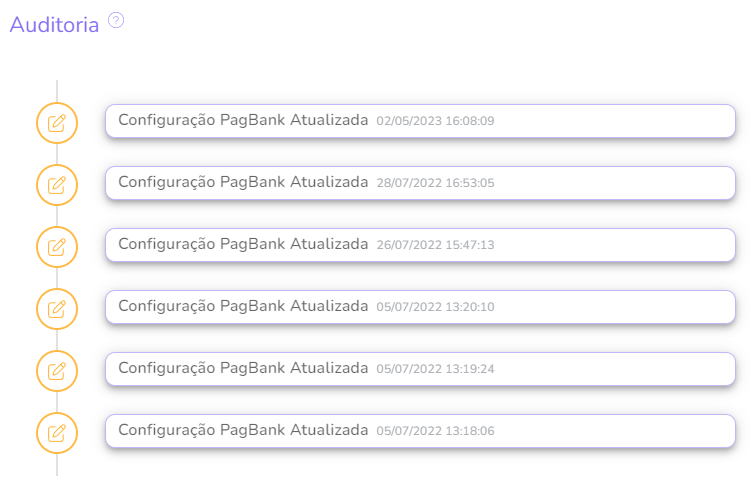 Você pode desativar, reativar sua integração com PagBank e também consultar o histórico de alterações realizadas (auditoria).