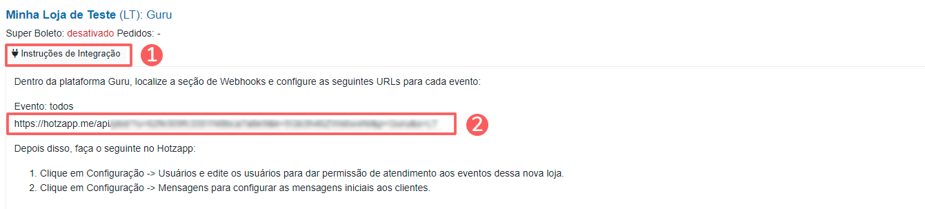 Neste passo, você deve acessar sua conta na Guru e configurar um webhook de e-ticket, de venda ou de assinatura para enviar as notificações para a Hotzapp.