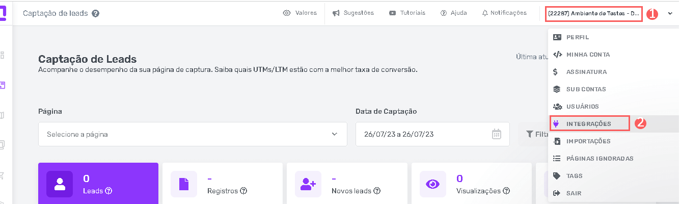 2 - No menu superior direito, clique no perfil e, em seguida, Integrações.