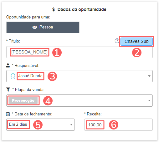 Chaves Sub (opcional): se desejar, clique neste botão para adicionar variáveis dinâmicas ao título - Ex.: Nome da Pessoa;