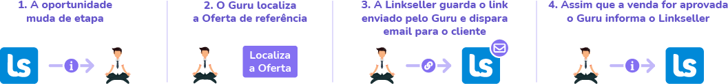 1 - A ativação da automação acontece do lado do LinkSeller, quando uma oportunidade muda para uma etapa configurada como gatilho (ex: Aguardando Efet.). Quando isso acontece, o Linkseller envia para a sua conta Guru um pedido de geração de link de checkout.