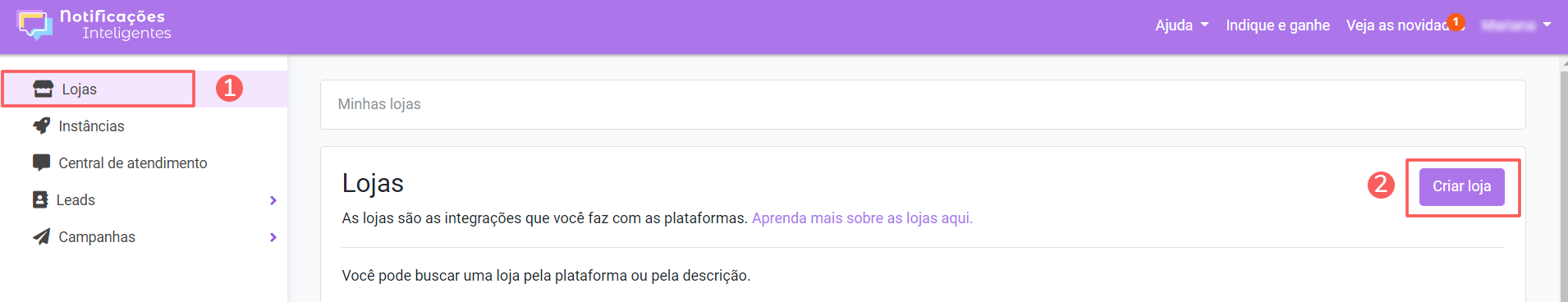 2 – No menu lateral, clique em Lojas e, em seguida, acesse Criar loja.