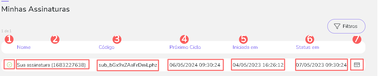 Código: número de identificação da assinatura- passe o mouse por cima do código para consultar o processador de pagamento associado;