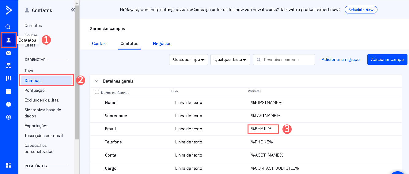 2 - No menu lateral esquerdo, acesse Contatos, e em seguida clique em Campos e copie o Valor do Email.