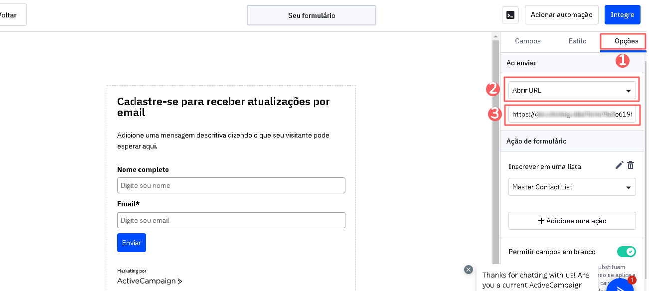 Passo 3: Configurar redirecionamento no formulário do Active Campaign